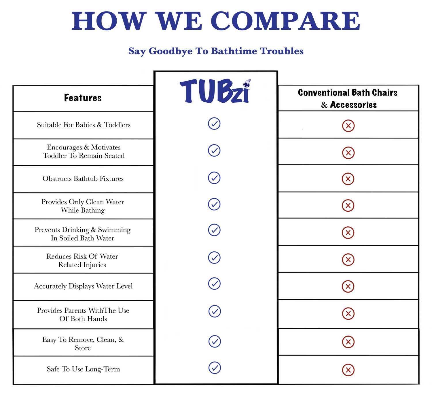 Other bath accessories require at least one hand to address many bathtime concerns such as keeping your child from pulling to stand on tub fixtures, crawling, swimming in dirty water, leaving you with only one hand to wash and soap. As your child becomes more mobile and accomplishes new and exciting physical milestones, TUBzi does the work for you by keeping your child willingly seated and engaged to allow parents to use both hands to wash, support and play during bathtime!